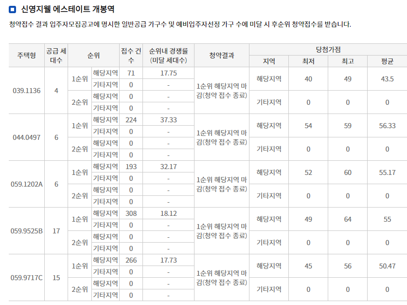 경쟁률과 청약점수는 위와 같았다.